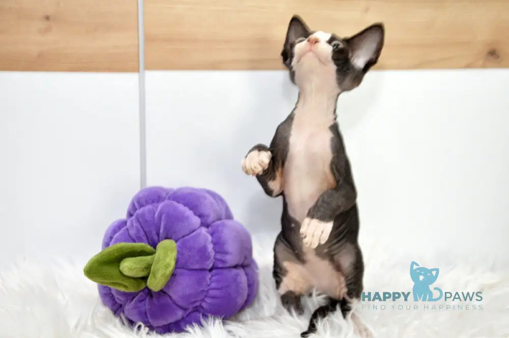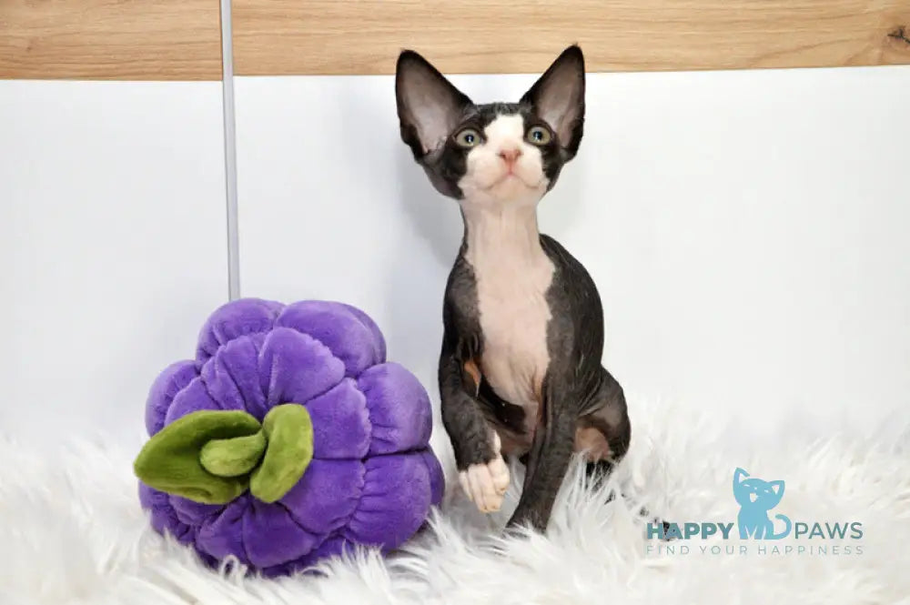 The Lelik Devon Rex male, black bicolour, exemplifies the distinctive charm of the Devon Rex breed with its short, curly coat and large, expressive eyes. This cat’s striking black bicolour pattern enhances its unique appearance, while its playful and affectionate nature makes it an engaging companion. Ideal for those seeking an intelligent and social feline, the Lelik Devon Rex blends elegance with spirited personality.