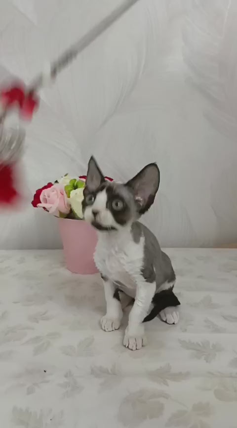 Meet this striking Leo Devon Rex male with a sophisticated black bicolour coat. Devon Rex cats are renowned for their distinctive soft, wavy fur and elfin features, and this handsome boy exemplifies the breed's elegant charm. With his sleek black and white markings, he presents a classic, eye-catching appearance. Devon Rex males are known for their playful, affectionate personalities and intelligent nature, making them wonderful companions for active households. Their unique coat requires gentle grooming to maintain its soft texture. This boy is ready to bring personality, charm, and devoted companionship to his forever home.