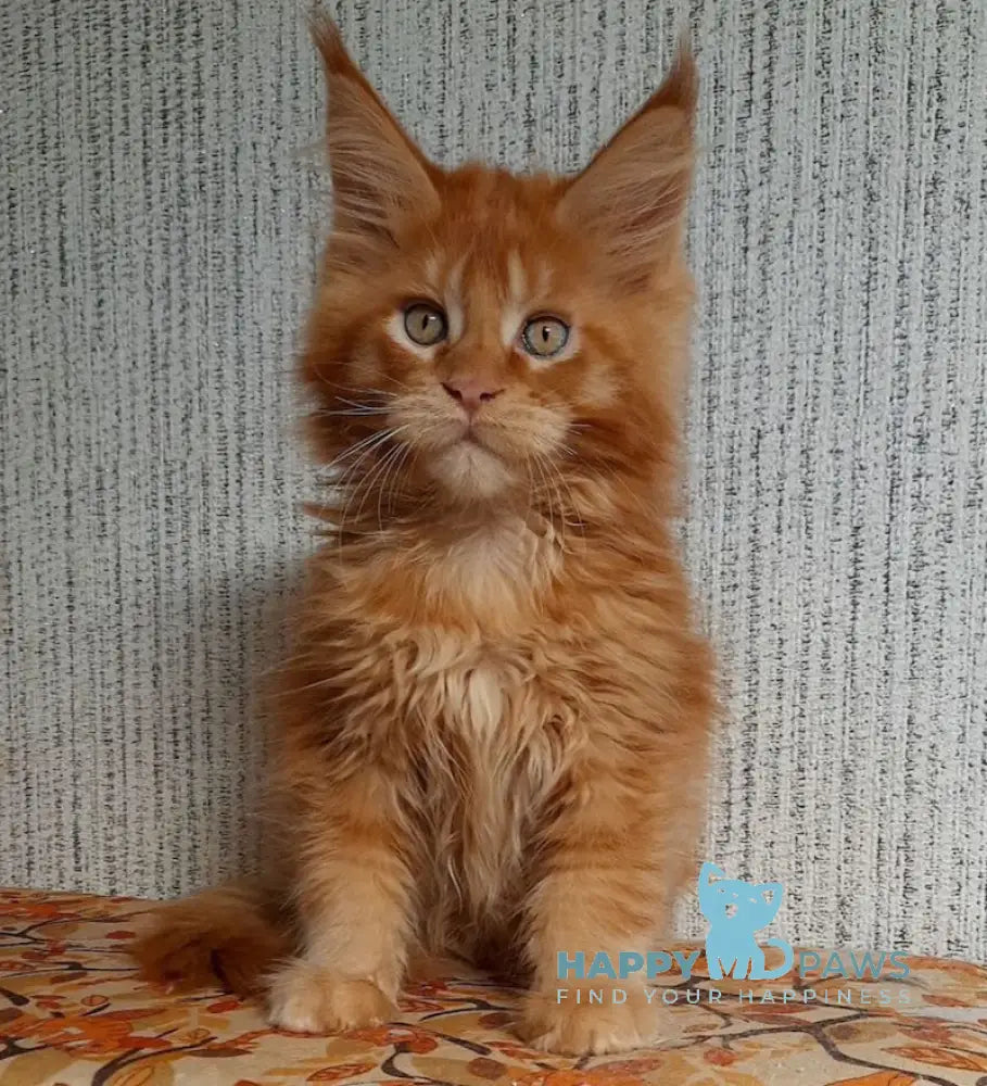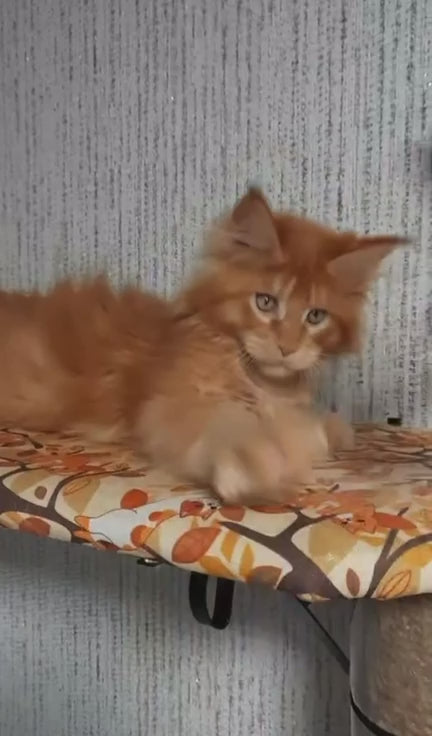 Meet Leo, a stunning male Maine Coon with a striking red ticked tabby coat. This majestic breed is renowned for its impressive size, intelligent temperament, and gentle disposition, making Leo an exceptional companion for families seeking a devoted feline friend. Maine Coons are known for their playful nature, adaptability to various living environments, and affectionate bonds with their owners. Leo's distinctive red ticked tabby pattern showcases the breed's natural beauty and genetic heritage. As a kitten, Leo represents the beginning of a long, rewarding relationship with one of the cat world's most beloved and personable breeds.