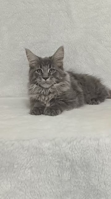 The Leonis Maine Coon male in blue tabby showcases the breed's hallmark robust physique and striking coat pattern. Known for their intelligence and gentle temperament, this male exemplifies the natural beauty and distinguished traits of the Maine Coon lineage. His dense blue tabby fur provides both a handsome appearance and practical insulation, making him an excellent companion for various climates. Ideal for those seeking a confident yet affectionate feline with a strong pedigree.