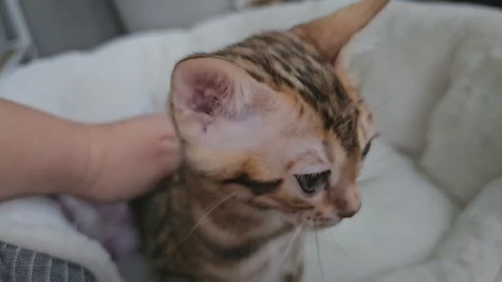 Lexa is a stunning black spotted tabby Bengal female, showcasing the breed's distinctive wild appearance with refined domestic temperament. Her striking coat displays bold, high-contrast spots characteristic of premium Bengal bloodlines, combined with a sleek, muscular build and alert, intelligent expression. This young female exhibits the playful, energetic nature Bengals are renowned for, making her an excellent choice for active households. Lexa's sociable personality and curiosity promise an engaging companion. As a registered Bengal, she carries the breed's signature traits: exceptional athleticism, vocal communication, and strong bonds with her family. Ideal for experienced cat owners seeking a beautiful, interactive feline with genuine personality.