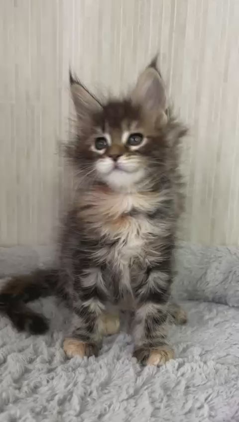 Lilia is a stunning female Maine Coon displaying the classic black tortoiseshell tabby pattern. This majestic breed is renowned for its impressive size, luxurious long coat, and gentle temperament. Maine Coons are intelligent, affectionate companions that thrive in family environments and adapt well to various living spaces. Lilia's striking coloring—a rich blend of black and warm tortoiseshell tones with distinct tabby markings—showcases the breed's natural beauty. Known for their playful yet calm demeanor, Maine Coons make exceptional pets for those seeking a loyal, interactive feline companion with a distinctive personality.