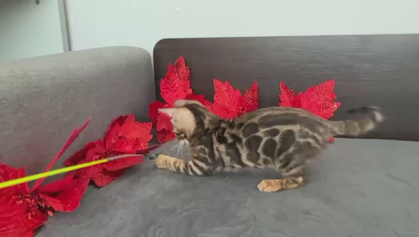 Meet Lilith, a stunning black spotted tabby Bengal male with the distinctive wild appearance that makes this breed so captivating. This exceptional feline showcases the breed's signature rosette markings and sleek, muscular build, combined with an intelligent and playful temperament. Bengals are known for their high energy, curiosity, and strong bonds with their owners. Lilith displays the breed's characteristic athleticism and engaging personality, making him an ideal companion for active households. As a registered Bengal, he carries the breed's hallmark beauty and spirited nature, perfect for those seeking a truly remarkable feline companion.