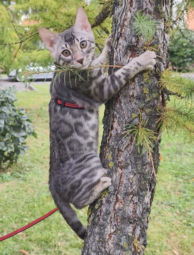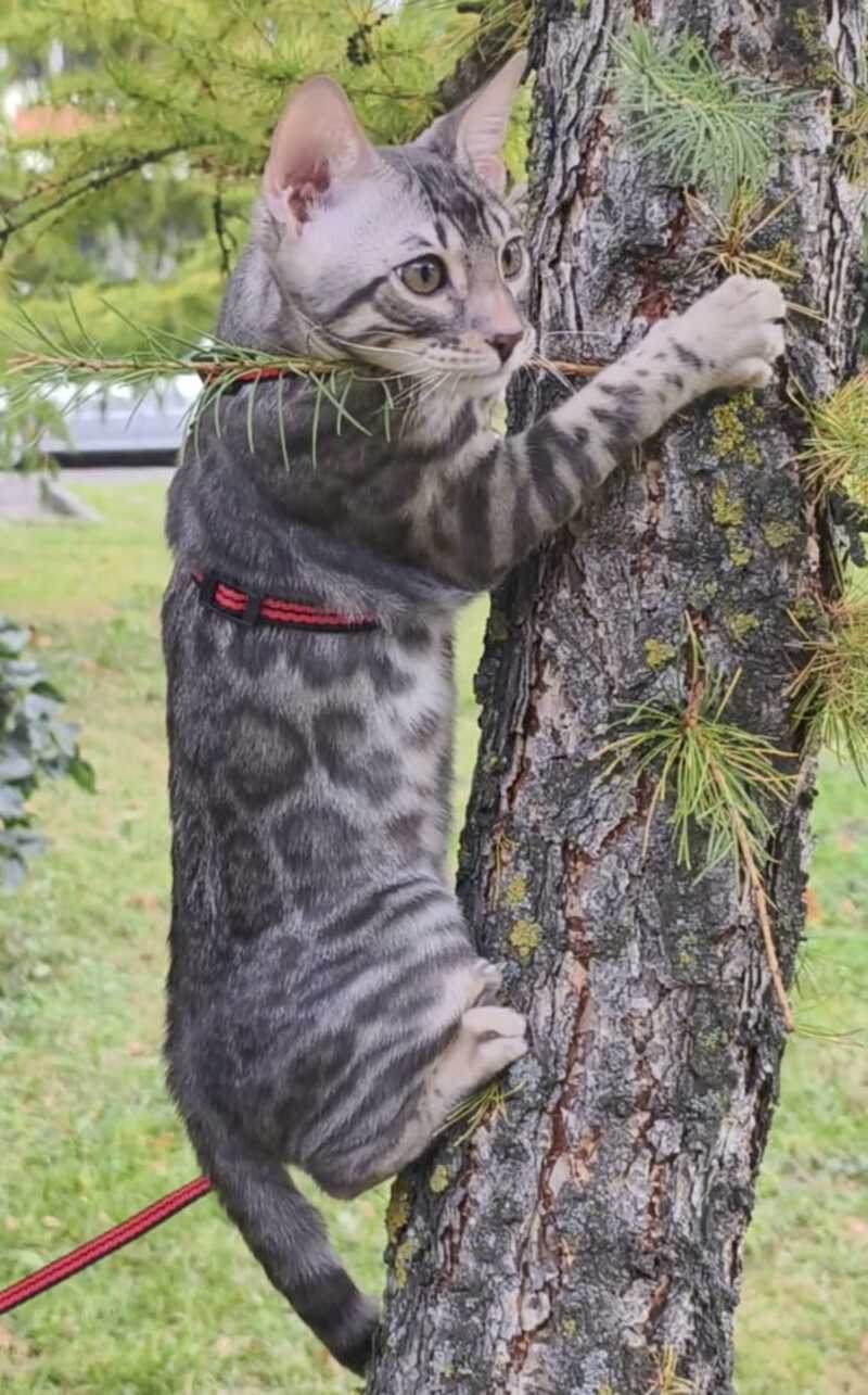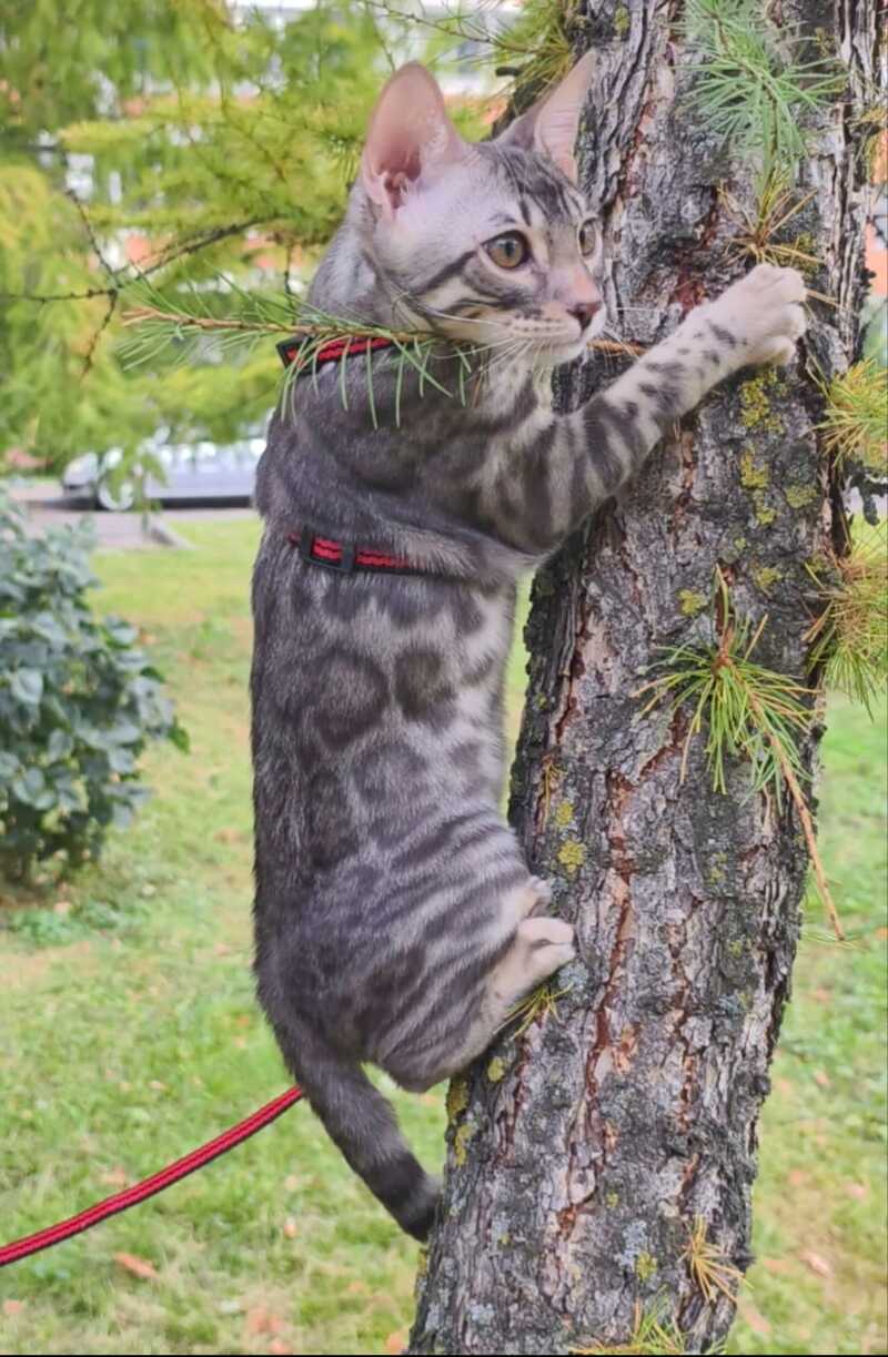 Loki is a striking male Bengal cat with a rare blue silver spotted tabby coat, showcasing a blend of elegance and wild beauty. Known for their active and intelligent nature, Bengals like Loki thrive in engaging environments that stimulate their natural curiosity. His distinctive pattern and sleek fur make him a captivating companion, while his playful and affectionate personality ensures he will enrich any home with both charm and vitality. Perfect for those seeking an exotic yet loyal feline friend.