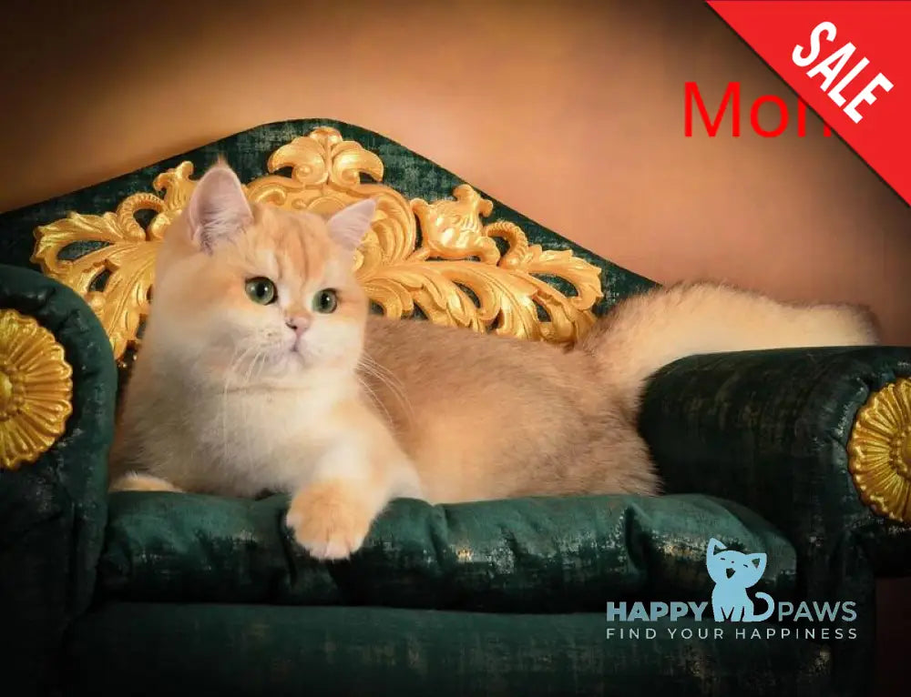 The Loreen British Shorthair female in black golden chinchilla showcases a striking coat with a rich blend of black and golden hues, accentuated by a delicate chinchilla pattern. Known for their calm demeanor and robust health, British Shorthairs make excellent companions. This female’s luxurious fur and balanced temperament embody the breed’s classic appeal, making her a distinguished addition to any cat enthusiast’s home.