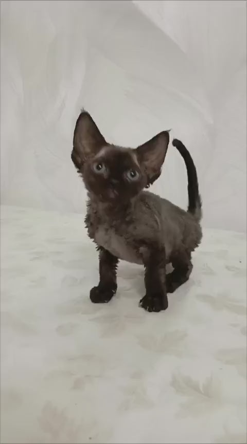 Luna is a stunning black Devon Rex female kitten with the breed's signature elfin features and silky soft coat. Known for their playful, affectionate nature, Devon Rex cats thrive on human companionship and make exceptional family pets. Luna's sleek black coloring highlights her delicate bone structure and large ears perfectly. This intelligent, energetic kitten will bring endless entertainment and warmth to your home, bonding closely with her family while maintaining the breed's characteristic curiosity and charm.