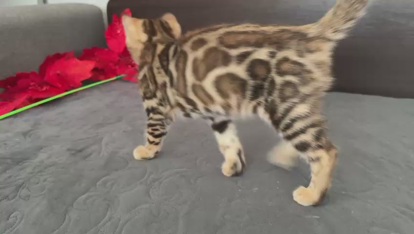 Luna is a stunning black spotted tabby Bengal female with the coveted gold coloring that makes this breed so distinctive. Her striking spotted pattern showcases the wild ancestry characteristic of Bengals, while her affectionate temperament and intelligent nature make her an exceptional companion. With her sleek, muscular build and mesmerizing coat, Luna embodies the perfect blend of exotic beauty and domestic charm. Ideal for experienced cat enthusiasts seeking an active, engaging feline with remarkable personality and presence.