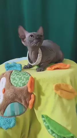Meet Luna Noir, a stunning Canadian Sphynx female with a sleek black coat. This hairless breed is known for her warm, velvety skin and affectionate personality. Luna Noir makes an ideal companion for those seeking a unique, hypoallergenic pet that thrives on human interaction and attention. Her striking appearance and playful nature bring joy and entertainment to any home. Perfect for dedicated owners ready to provide specialized care and warmth.