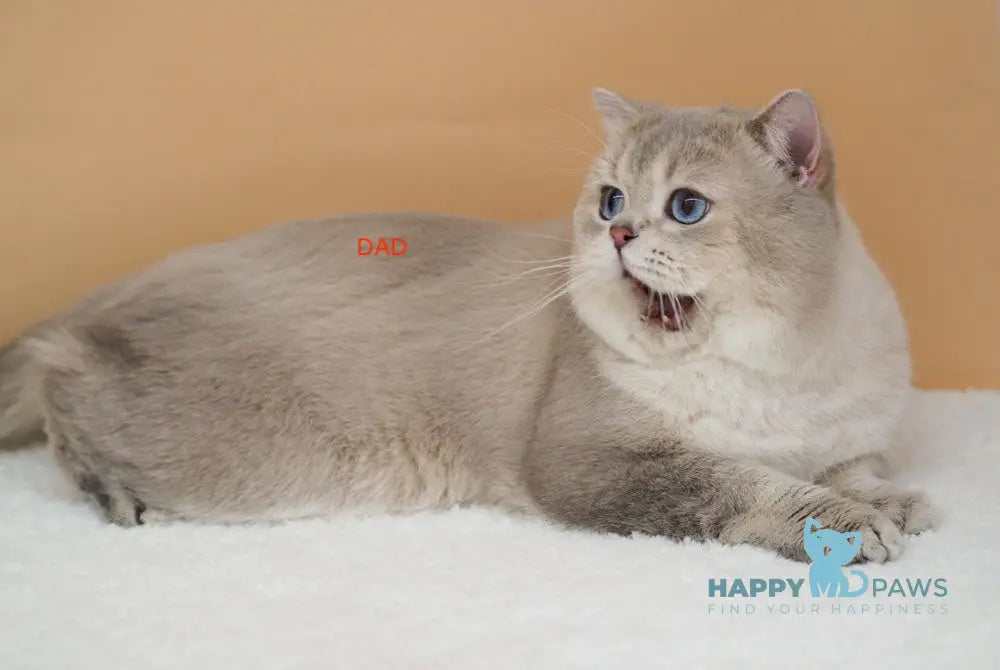 Luxury Scottish Fold female with a soft lilac golden ticked tabby bicolour coat. She has a delicate pastel glow, perfectly balanced markings, and a plush, silky texture. Her folded ears and expressive eyes give her an elegant, gentle appearance. A truly refined and charming companion with a calm, affectionate nature.