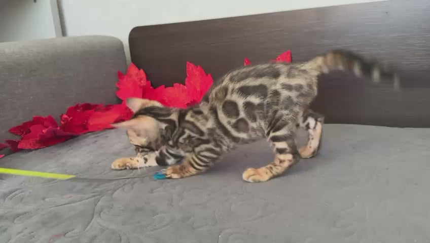 Meet Marcel, a stunning black spotted tabby Bengal male with the distinctive markings and athletic build that make this breed so captivating. Bengal cats are known for their wild appearance combined with affectionate, intelligent personalities. Marcel displays the characteristic rosette or spot patterns that define the breed, along with a sleek, muscular frame built for agility and play. As a Bengal, he brings boundless energy, curiosity, and loyalty to his home. These cats thrive with interactive engagement and mental stimulation, making them ideal for active households. Marcel's striking appearance and engaging temperament make him a remarkable companion for experienced cat owners seeking a breed with genuine personality and presence.