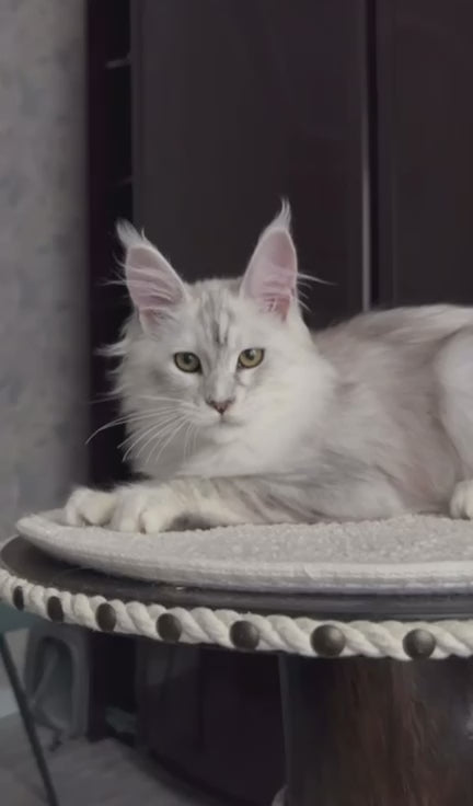 Meet Marusya, an exquisite female Maine Coon kitten showcasing the striking black silver ticked tabby pattern. This majestic breed is renowned for its impressive size, intelligent temperament, and luxurious coat. Marusya displays the characteristic Maine Coon traits: a muscular build, tufted ears, and a flowing tail. Her silver-ticked tabby markings create a sophisticated appearance with distinct contrast and depth. Maine Coons are known for their gentle, sociable nature and adaptability to family life. Marusya represents the breed's hallmark elegance and makes an exceptional companion for those seeking a distinguished feline with a loving disposition.
