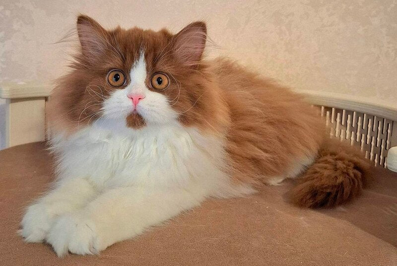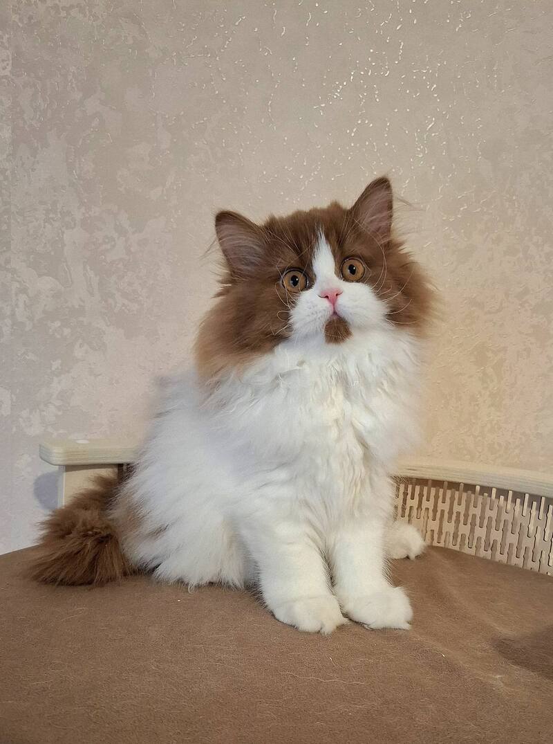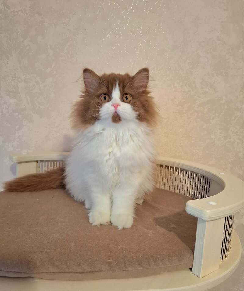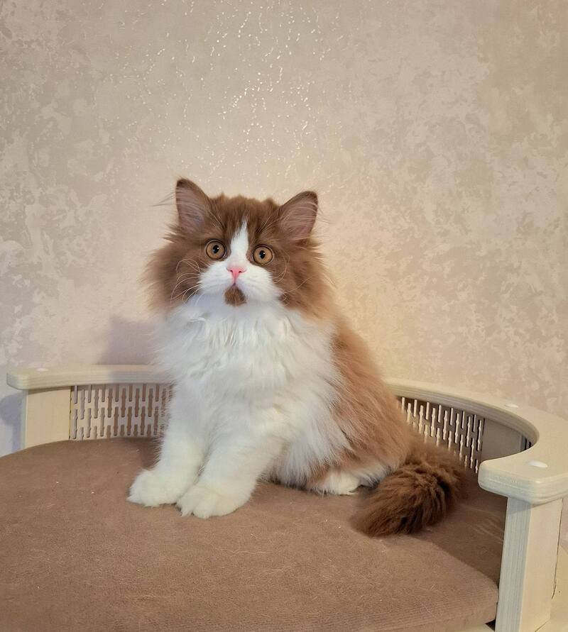 Matilda Selkirk is a female with a straight coat exhibiting a distinctive cinnamon bicolour pattern. This striking combination enhances her natural elegance and showcases excellent coat health. Perfect for those seeking an expert-level example of breed-standard coloration and smooth texture, Matilda represents refined genetics and visual appeal in her category.