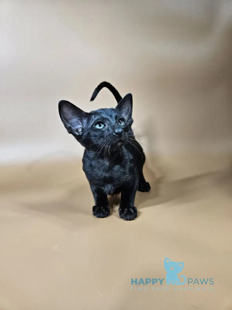 Meet Melanica, an exquisite Oriental Shorthair female with a striking jet-black coat. This elegant feline showcases the breed's signature sleek physique, large expressive ears, and refined facial structure. Oriental Shorthairs are renowned for their intelligence, vocal nature, and devoted companionship. Melanica combines stunning aesthetics with an affectionate, interactive personality, making her an ideal companion for those seeking an engaging and visually captivating cat. Her short, glossy coat requires minimal grooming while maintaining its lustrous appearance.