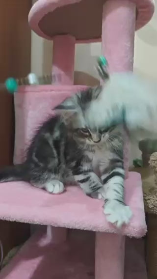 Meet Mikki, a striking Maine Coon male showcasing the classic black silver tabby pattern accented with pristine white markings. This majestic breed is renowned for its impressive size, intelligent temperament, and gentle disposition. Maine Coons excel as devoted family companions, displaying remarkable adaptability to various living environments. Mikki's distinctive coat combines the dramatic contrast of silver-tipped guard hairs with deep tabby striping, creating an eye-catching appearance. Known for their playful yet calm nature, Maine Coons like Mikki thrive on interactive engagement and make exceptional indoor pets. Their semi-long, water-resistant coat requires regular grooming to maintain optimal health and beauty. An ideal choice for those seeking a large, affectionate feline with a captivating presence and loyal companionship.