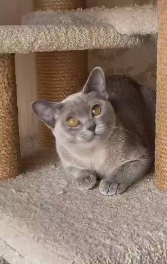 Mila is a stunning blue Burmese female cat, renowned for her striking sapphire-gray coat and captivating golden eyes. This breed exemplifies elegance and intelligence, with a muscular yet graceful build. Burmese cats are exceptionally affectionate and social companions, thriving on human interaction and forming deep bonds with their families. Mila's gentle temperament, combined with her playful nature and vocal expressiveness, makes her an ideal addition to households seeking an engaging, devoted feline companion. Her short, glossy coat requires minimal grooming while maintaining its luxurious appearance.