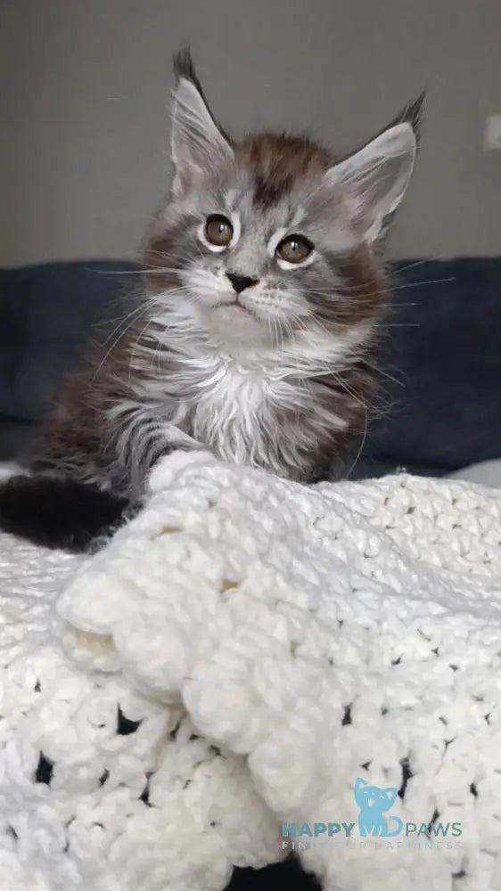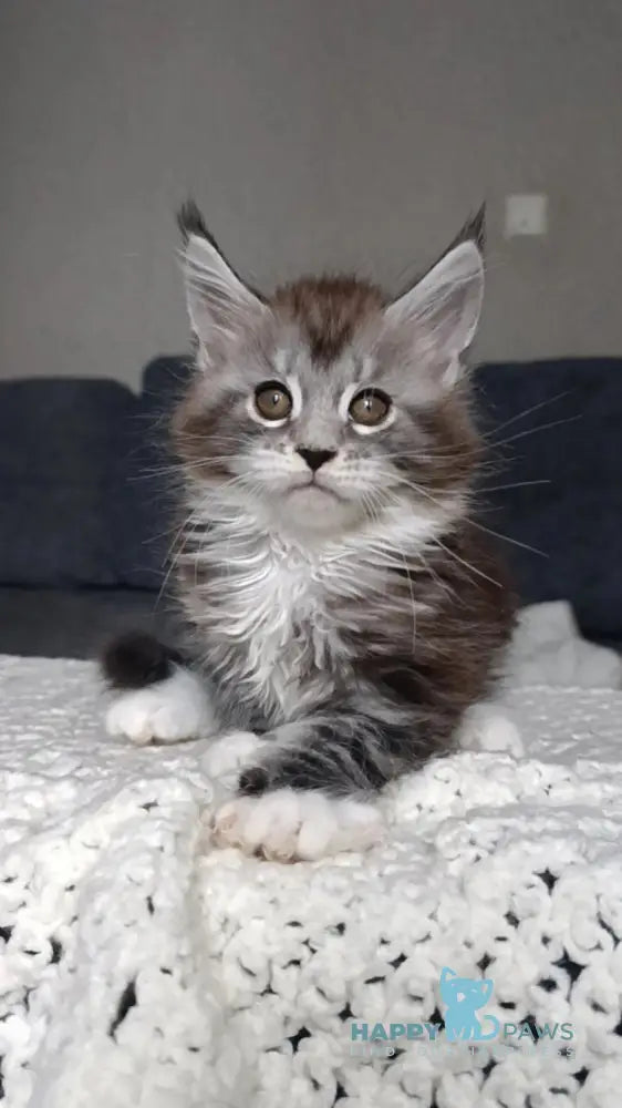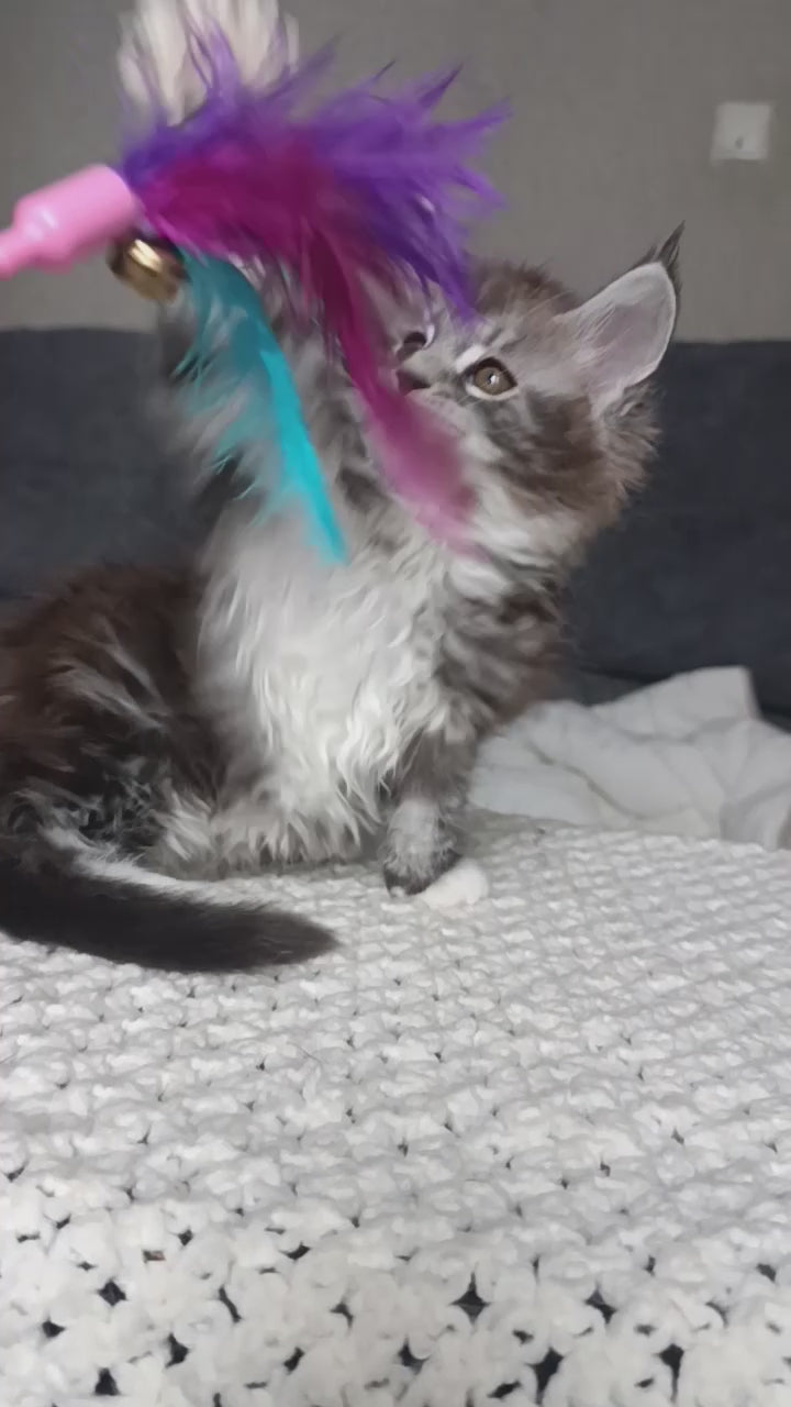 Mila is a stunning Maine Coon female with a black silver tabby bicolour coat that shimmers beautifully in the light. Her long, flowing fur and tufted ears give her a majestic yet graceful appearance. She has a confident but gentle personality, always curious about her surroundings. Affectionate and intelligent, Mila loves attention while still carrying herself with elegant independence.