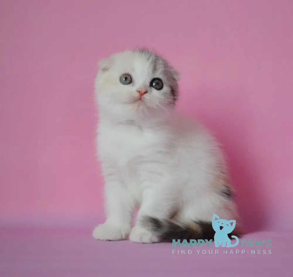 Mira is a stunning Scottish Fold female with a unique black tortie silver harlequin coat that gives her a striking, elegant appearance. Her folded ears and expressive eyes add to her sweet and captivating charm. Gentle and affectionate, she enjoys quiet moments and playful interactions alike. Mira’s rare coloring and warm personality make her truly unforgettable.