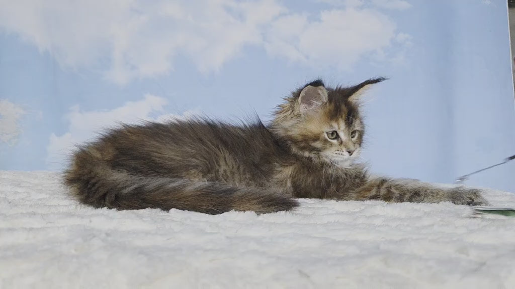 Mongolia Maine Coon female, black tortie ticked tabby. This stunning feline exemplifies the breed's hallmark characteristics: a robust, muscular build with a luxuriously long, flowing coat displaying intricate black tortoiseshell and ticked tabby patterns. Maine Coons are renowned for their intelligence, gentle temperament, and sociable nature, making them exceptional companions for families and multi-pet households. Females typically weigh 8-12 pounds and reach full maturity by age 3-5 years. Her distinctive coloring—a sophisticated blend of black and warm tortoiseshell hues with delicate tabby markings—ensures she'll be a striking presence in any home. Expect a vocal, affectionate cat who thrives on interaction and enjoys both playtime and quiet companionship.