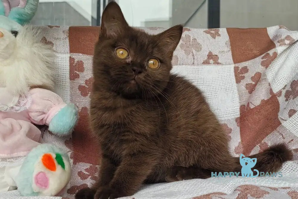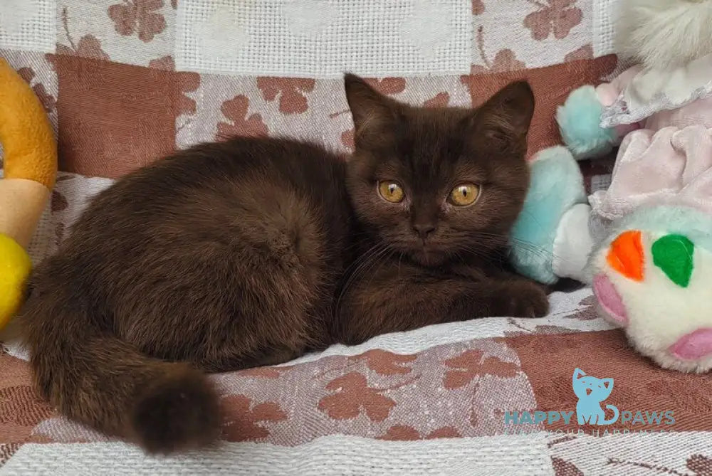 Monika is a female British Shorthair cat with a distinctive chocolate coat, known for its dense, plush fur and rounded, muscular build. This breed is appreciated for its calm temperament and affectionate nature, making Monika an excellent companion for both families and individuals. Her striking chocolate color enhances her classic British Shorthair appearance, combining elegance with a sturdy, gentle personality. Monika embodies the breed's hallmark balance of beauty and amiability, ideal for those seeking a loyal and low-maintenance pet.