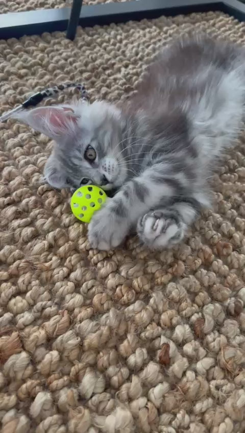 Meet Tiny, a remarkable male Maine Coon kitten with an exquisite black silver tabby coat. Despite his name, this breed grows into one of the largest domestic cat varieties, known for their commanding presence and substantial bone structure. Maine Coons excel as family companions, offering unwavering loyalty, keen intelligence, and a naturally gentle disposition. Tiny's striking tabby markings showcase the breed's distinctive aesthetic appeal. These cats demonstrate exceptional problem-solving abilities and enjoy interactive engagement with their owners. Maine Coons adapt well to various home environments and are renowned for their patient, affectionate nature. An outstanding choice for discerning cat enthusiasts seeking a sophisticated, engaging feline companion with remarkable character and presence.