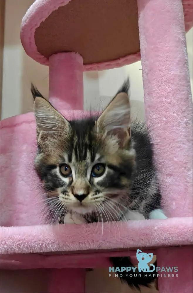 Morgan is a striking Maine Coon male showcasing the classic black silver tabby pattern beautifully accented with white markings. This majestic breed is renowned for its impressive size, intelligent temperament, and gentle disposition, making Morgan an exceptional companion for families and experienced cat enthusiasts alike. Maine Coons are known for their playful, affectionate nature and remarkable adaptability to various living environments. Morgan's distinctive coloring and breed characteristics promise a loyal, engaging feline friend with the charm and personality this beloved breed is celebrated for.