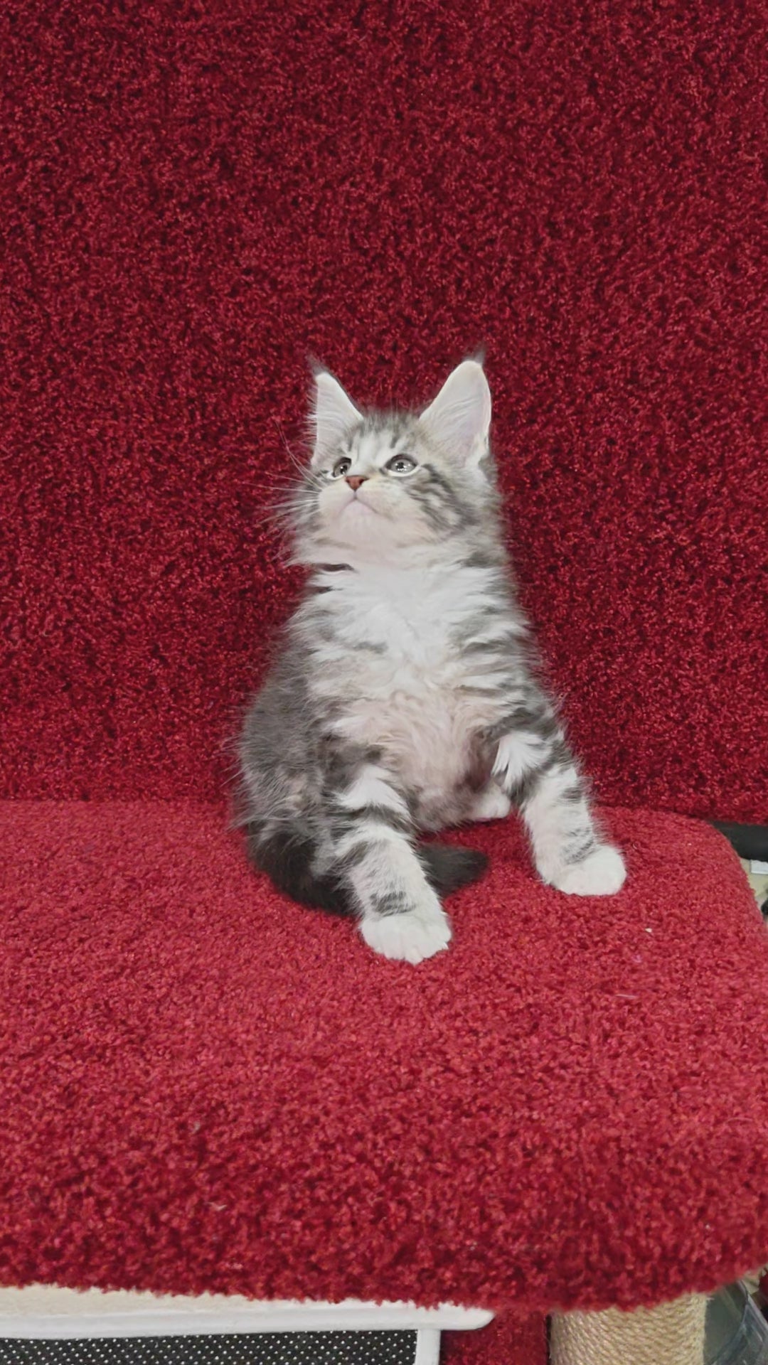 Morris is a striking male Maine Coon with a black silver tabby coat accented by patches of clean white. Known for their large size and friendly temperament, Maine Coons like Morris are prized for their luxurious fur, tufted ears, and expressive eyes. His distinctive coloring combined with his breed's gentle nature makes him an exceptional companion and a standout addition to any cat enthusiast’s home.
