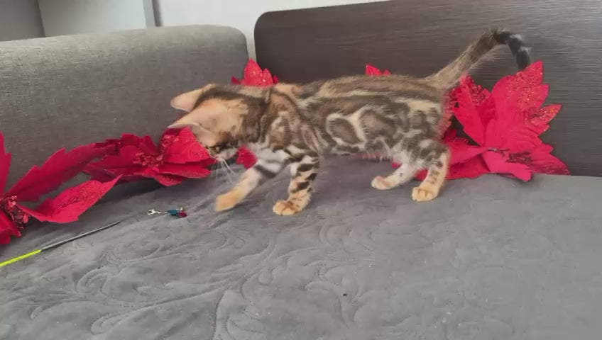 This stunning Bengal male showcases the breed's most coveted markings—a jet-black spotted tabby pattern that gleams against a silvery-grey coat. Known for their confident, engaging personalities, Narcissist displays the intelligence and athleticism Bengal enthusiasts prize. His striking rosette spots and muscular build reflect generations of selective breeding for both beauty and temperament. Perfect for experienced cat owners seeking a charismatic, interactive companion with wild aesthetics and a devoted, people-oriented nature.