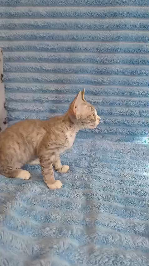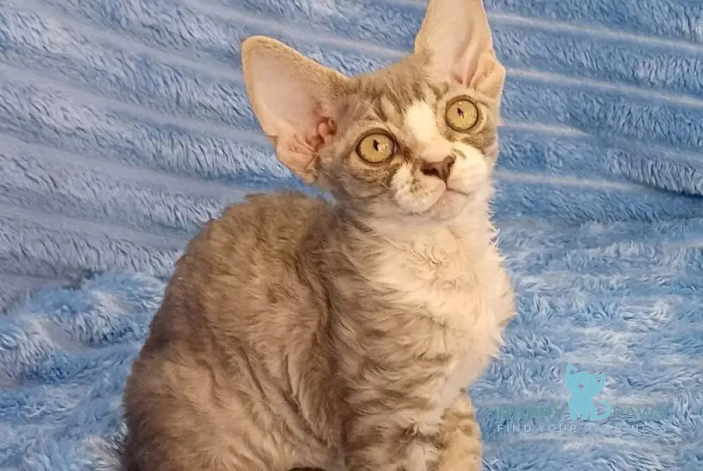 The Neisi Devon Rex female in blue bicolour is a distinctive feline known for its wavy coat, large expressive eyes, and playful temperament. This breed exhibits a unique combination of striking blue and white coloring that enhances its elegant appearance. Ideal for experienced cat enthusiasts, the Devon Rex’s affectionate and intelligent nature makes it a rewarding companion that thrives with interactive care and attention. This specimen represents the breed’s hallmark traits in both aesthetics and personality, appealing to those seeking a refined and engaging pet.