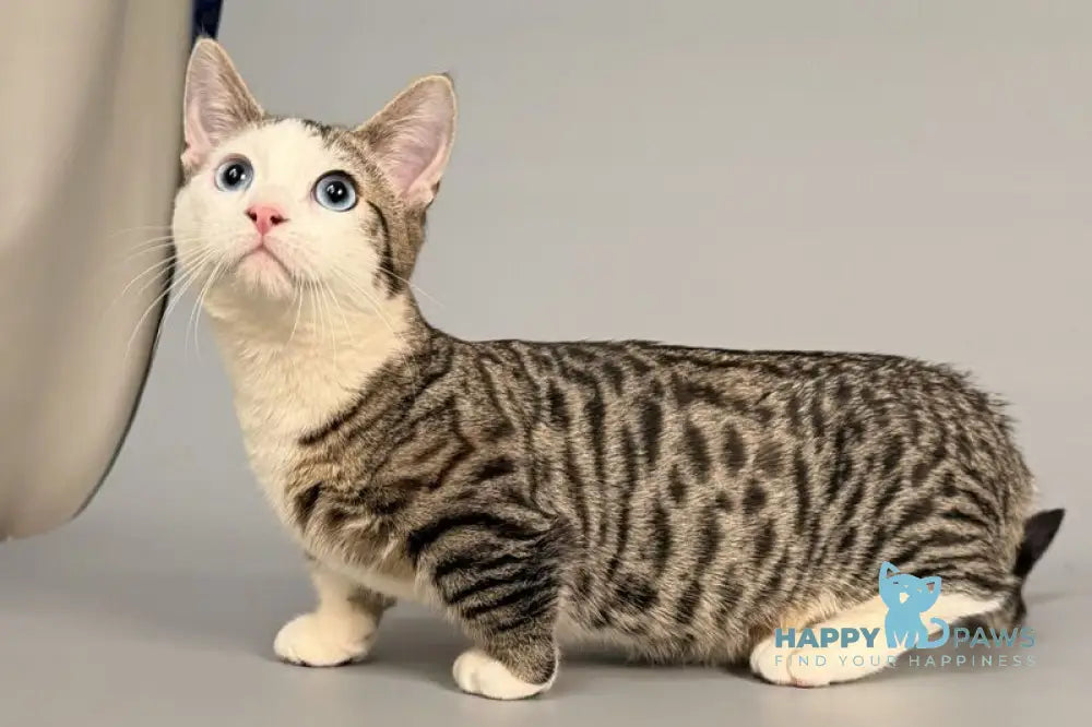 Meet Nemoir, a striking male Munchkin with a captivating black spotted tabby bicolour coat. This breed combines the distinctive short legs characteristic of Munchkins with an eye-catching pattern featuring bold black spots and markings against a lighter base. Nemoir's unique coloration and compact frame make him a visually distinctive companion. Munchkins are known for their playful, curious nature and surprising agility despite their short stature. This particular specimen's bicolour pattern adds to his appeal, creating natural contrast that highlights his alert expression and engaging personality. Ideal for those seeking a cat with both aesthetic charm and an entertaining, interactive temperament.