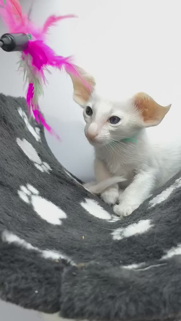 Meet your sophisticated feline companion—a striking Neo Oriental Shorthair male with a pristine white coat. This breed exemplifies elegance through its sleek, muscular frame and distinctively large ears that enhance their alert, intelligent expression. Neo Oriental Shorthairs are known for their vocal, affectionate nature and exceptional bonds with their owners. Their short, glossy white coat requires minimal grooming while maintaining a luminous appearance. Highly social and playful, these cats thrive on interaction and mental stimulation, making them ideal for engaged households. Their graceful movements and captivating personality transform any home into a more vibrant space.