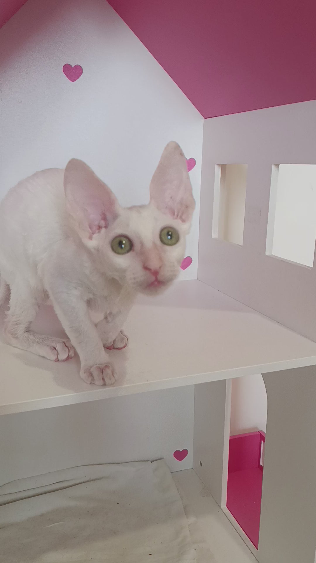 Nest is an elegant white Cornish Rex with a sleek, wavy coat and long, slender lines. His large ears and curious eyes give him an alert, intelligent expression. Active and affectionate, he loves to follow people around and be involved in everything. His playful energy is balanced by moments of warmth, when he happily curls up for attention.