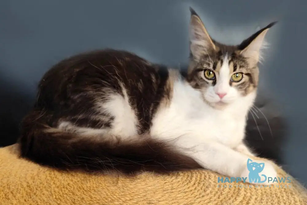 Ninel is a female Maine Coon distinguished by her striking black tabby bicolour coat. This breed is known for its robust build, tufted ears, and expressive eyes, traits that combine to give Ninel an impressive and elegant appearance. Her distinctive bicolour pattern adds a unique charm, reflecting the breed’s rich genetic heritage. Ideal for experienced cat enthusiasts, Ninel embodies the distinctive Maine Coon characteristics of affectionate intelligence and gentle temperament.
