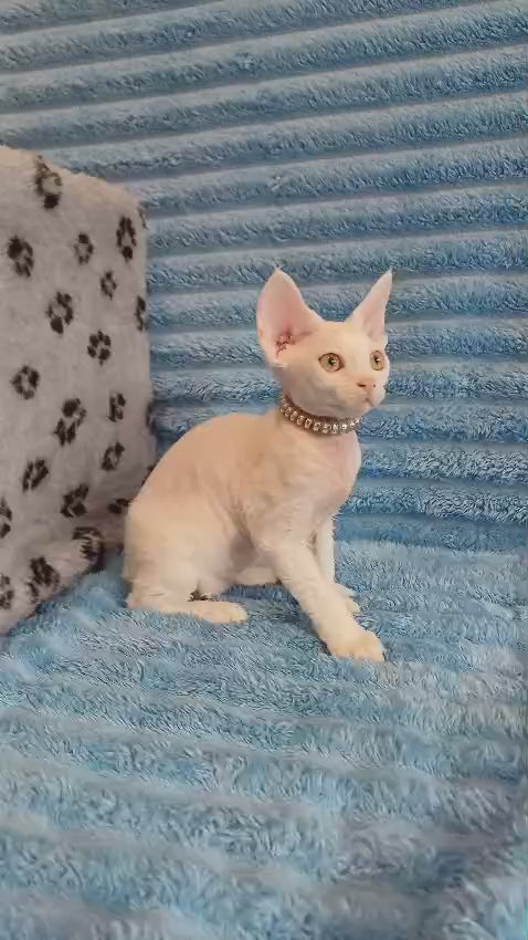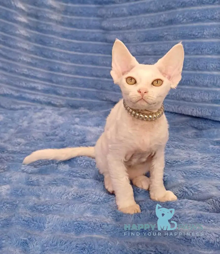 Nyssa is a female Devon Rex cat with a striking white coat, known for her distinctive curly fur and large expressive eyes. This breed is celebrated for its playful yet affectionate nature, making Nyssa an excellent companion for those seeking an intelligent and interactive pet. Her unique coat requires minimal grooming, adding convenience to her attractive appearance. Ideal for experienced cat lovers who appreciate the blend of personality and elegance in a Devon Rex.