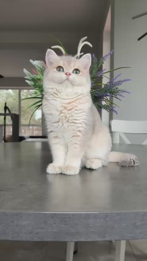 Odri is a stunning British Shorthair female showcasing the coveted blue golden shaded coat pattern. This rare coloration features a luxurious blend of soft blue-grey tones with warm golden highlights, creating an ethereal, multi-dimensional appearance. Known for their calm, affectionate temperament, British Shorthairs make exceptional companions for families and individuals alike. Odri combines the breed's signature plush double coat, round face, and gentle disposition with her distinctive coloring. Her pedigree and striking aesthetics make her an outstanding choice for those seeking a show-quality or breeding-quality feline companion with exceptional beauty and personality.