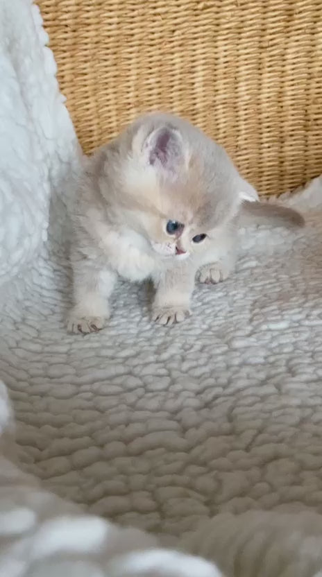 Odry is a lovely British Shorthair female with a rare lilac golden shaded coat that glows softly in the light. Her plush fur and bright, expressive eyes give her a graceful, elegant look. Calm and affectionate, she enjoys gentle attention and quiet moments. Odry’s sweet nature makes her a truly enchanting companion.