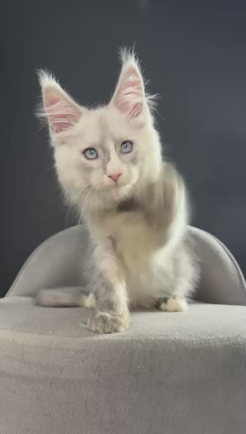 Meet Ogracio, a striking Maine Coon male showcasing the coveted blue silver coloring with elegant white markings. This majestic breed exemplifies the Maine Coon's renowned characteristics: substantial size, muscular build, and a gentle temperament that belies their impressive stature. Ogracio's distinctive coat pattern combines the cool tones of blue-silver with crisp white accents, creating a visually stunning appearance. Maine Coons are known for their intelligence, playful nature, and affectionate disposition, making them exceptional companions for families and experienced cat enthusiasts alike. With proper care and socialization, Ogracio promises years of companionship and joy.