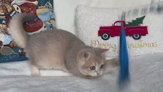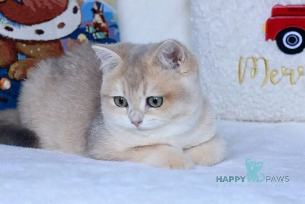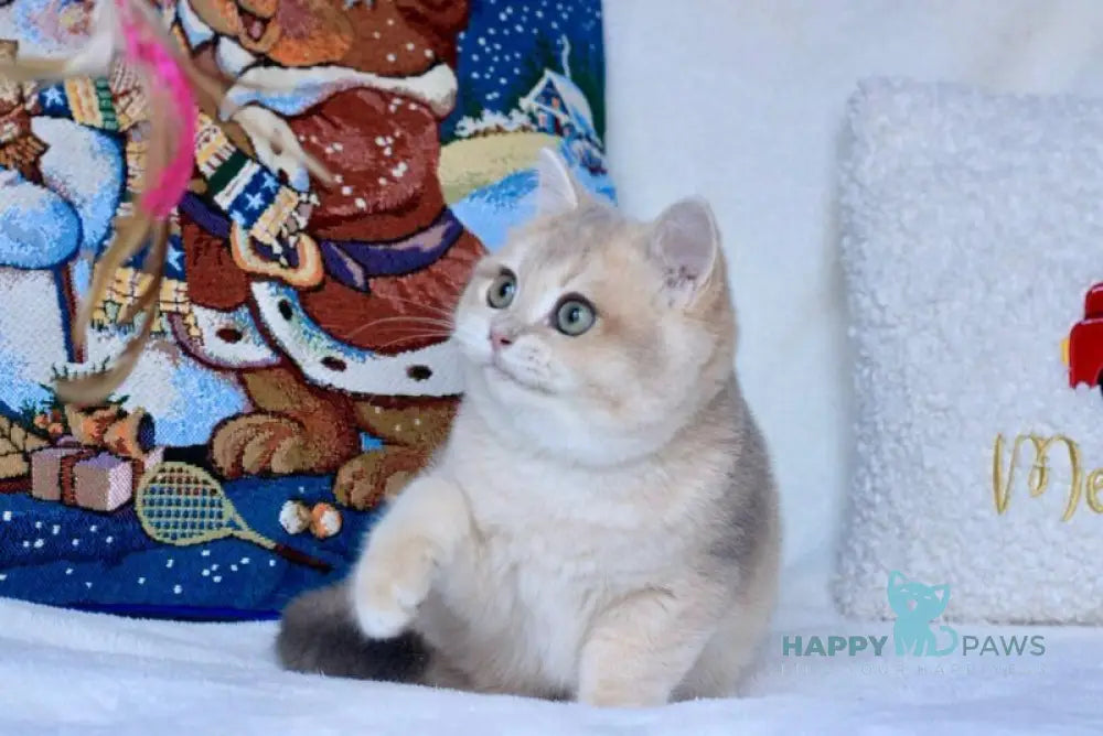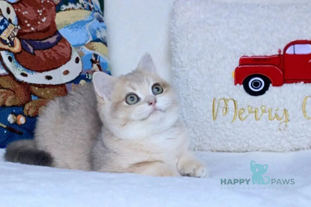 Meet Opal, an exceptional British Shorthair male showcasing the rare blue golden chinchilla coloration. This striking cat displays the breed's signature dense, plush coat with sophisticated silver-blue undertones and golden highlights that create a luminous appearance. Opal embodies the British Shorthair's calm, affectionate temperament and sturdy build, making him an ideal companion for families seeking a gentle, loyal feline. His distinctive coloring and pedigree quality make him a remarkable addition to any home.