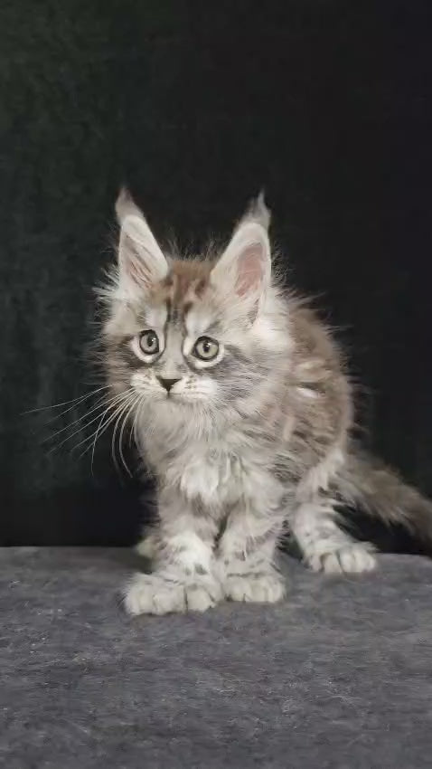 Otto is a distinguished polydactyl Maine Coon male showcasing a striking black silver tabby coat. Known for their large size and luxurious fur, Maine Coons like Otto combine robust health with a gentle temperament, making them exceptional companions. Otto’s unique polydactyl trait adds to his charm, giving him extra toes that enhance his agility and grip. This rare feature, along with his classic tabby pattern, reflects the breed’s natural rugged elegance and adaptability. Perfect for enthusiasts seeking a majestic and sociable feline with distinctive characteristics.