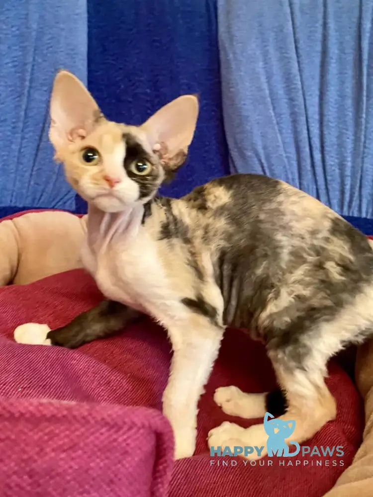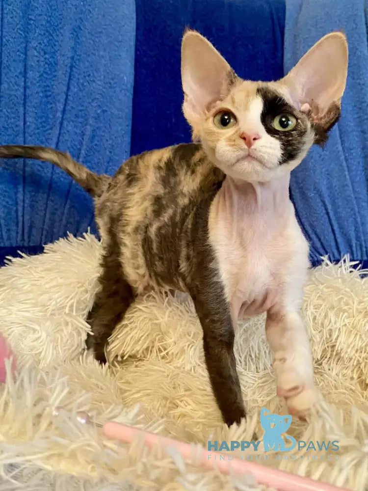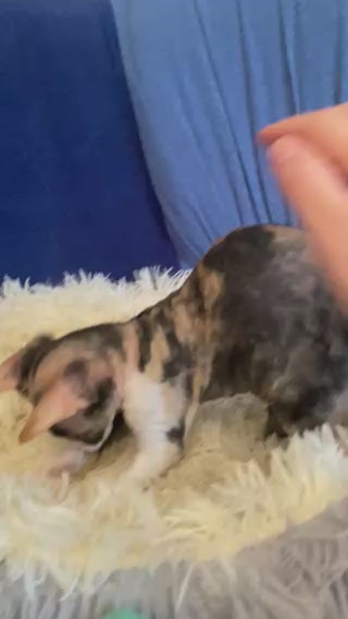 Paloma is a stunning Devon Rex female with a striking black tortoiseshell bicolour coat. This breed is known for its distinctive large ears, soft wavy fur, and playful, affectionate personality. Devon Rex cats are intelligent, social companions that thrive on interaction and love being involved in family activities. Paloma's unique coloring and charming temperament make her an exceptional addition to any loving home.