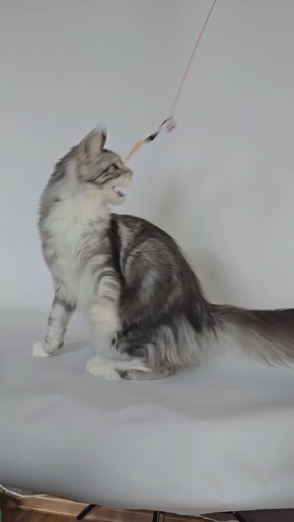 Pandora is a stunning female Maine Coon showcasing the coveted black silver tabby bicolour pattern. This majestic breed is renowned for its impressive size, muscular build, and tufted ears, making Pandora an exceptional example of the Maine Coon standard. Her striking silver-tipped coat with bold tabby markings creates a luminous, high-contrast appearance that turns heads. Maine Coons are celebrated for their intelligent, affectionate temperament and adaptability to family life. Pandora combines the breed's characteristic gentle nature with her distinctive aesthetic appeal, making her an outstanding choice for discerning feline enthusiasts seeking both beauty and companionship.