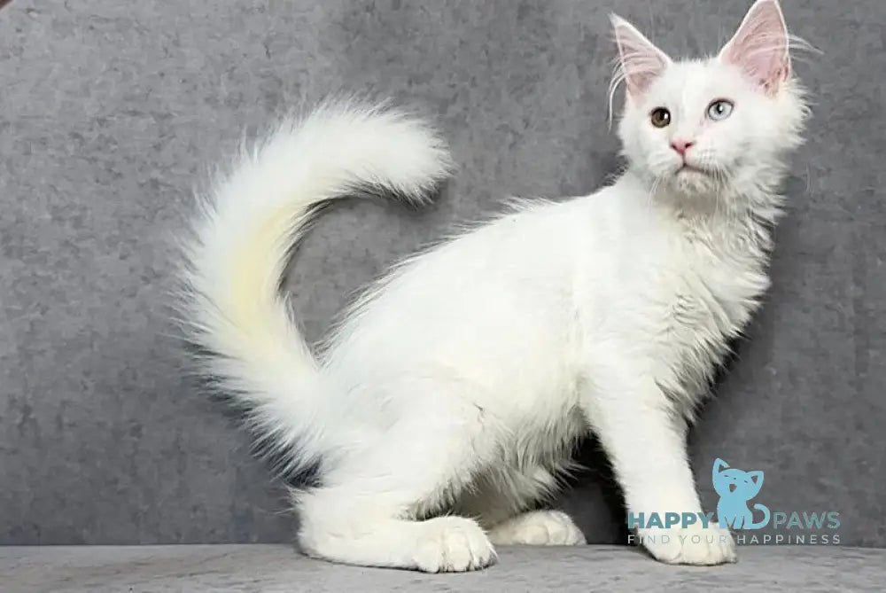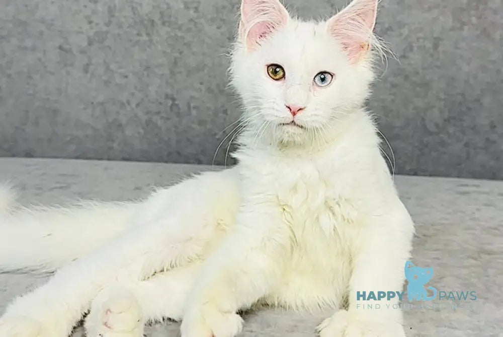 Pearla is a distinguished female Maine Coon with a pristine white coat, exemplifying the breed’s hallmark traits of size, intelligence, and gentle temperament. Known for their sociable nature and luxurious fur, Maine Coons like Pearla make an excellent companion for families and enthusiasts seeking a majestic yet affectionate pet. Her striking appearance combined with a calm disposition reflects the breed’s well-regarded lineage. Pearla represents the ideal balance of elegance and robustness that Maine Coon aficionados appreciate.