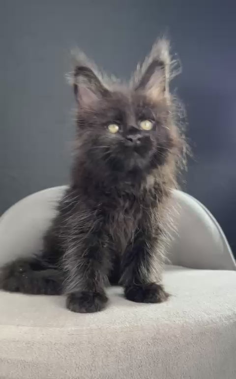 Pesnia is a striking black Maine Coon female, embodying the breed's legendary size and commanding presence. Known for their intelligence and gentle temperament, Maine Coons make exceptional companions for families seeking an affectionate yet independent feline. Pesnia's luxurious black coat showcases the breed's characteristic dense fur, designed for durability and weather resistance. As a female, she typically displays the breed's playful, social nature while maintaining a dignified composure. Maine Coons are renowned for their longevity and robust health, making them a rewarding long-term investment for dedicated cat enthusiasts.