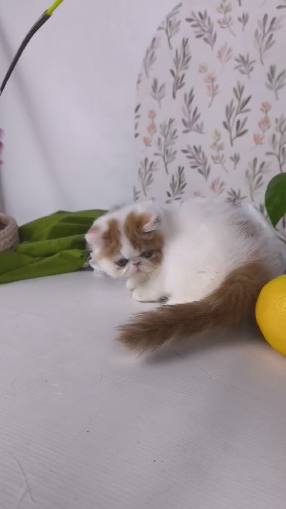 Piter Exotic is a distinguished cream van tabby male, showcasing the breed’s signature plush coat and striking tabby markings. His creamy white base contrasted with elegant tabby accents exemplifies the Exotic’s unique combination of a plush, dense coat and vivid patterning. Perfect for enthusiasts seeking a refined, well-groomed companion with a calm yet engaging temperament.