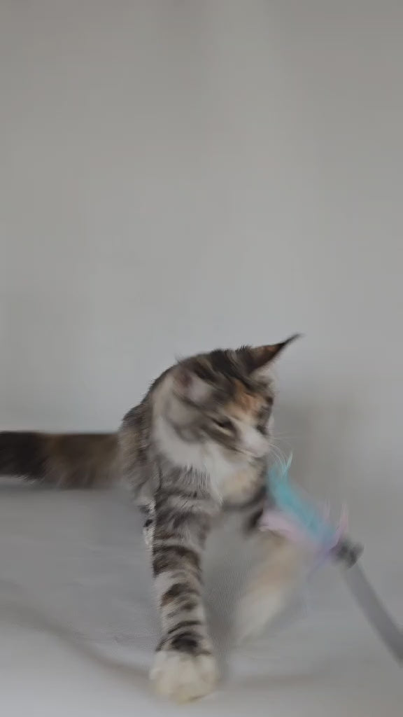 Poema is a stunning Maine Coon female showcasing the coveted black tortie silver tabby bicolour pattern. This majestic breed combines impressive size with gentle temperament, making her an exceptional companion. Maine Coons are renowned for their intelligence, playful nature, and dog-like loyalty. Poema's striking silver-tipped coat contrasts beautifully with deep black markings, creating a sophisticated appearance. These cats thrive in interactive environments and form strong bonds with their families. As a purebred Maine Coon, she represents the breed's characteristic tufted ears, bushy tail, and muscular build. Ideal for experienced cat enthusiasts seeking a remarkable feline companion.
