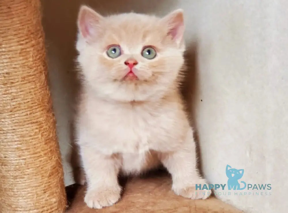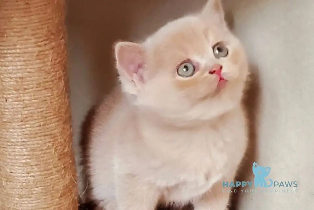 Meet Pomponella, a distinguished female British Shorthair in a rare fawn coloration. This breed is renowned for its dense, plush coat and characteristically round face with prominent cheeks. British Shorthairs exhibit a calm, independent temperament while maintaining affectionate bonds with their families. Pomponella exemplifies the breed's sturdy build and copper-colored eyes typical of fawn variants.