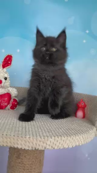 Prada represents the pinnacle of Maine Coon breeding excellence. This striking female showcases the breed's most coveted characteristics: a luxurious black silver coat with exceptional contrast and depth, substantial bone structure, and the distinctive tufted ears that define the Maine Coon standard. Her lineage reflects generations of selective breeding for health, temperament, and conformation. As a female, she offers exceptional breeding potential for serious enthusiasts and breeders. Prada combines the breed's legendary intelligence and gentle disposition with stunning visual presence, making her an outstanding choice for those seeking a premium Maine Coon companion.
