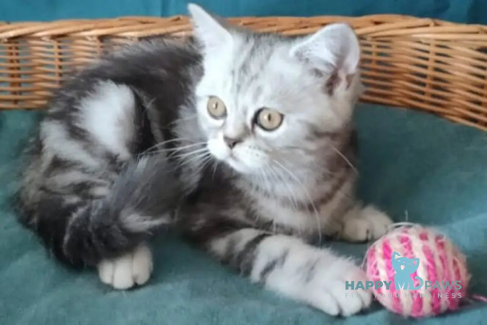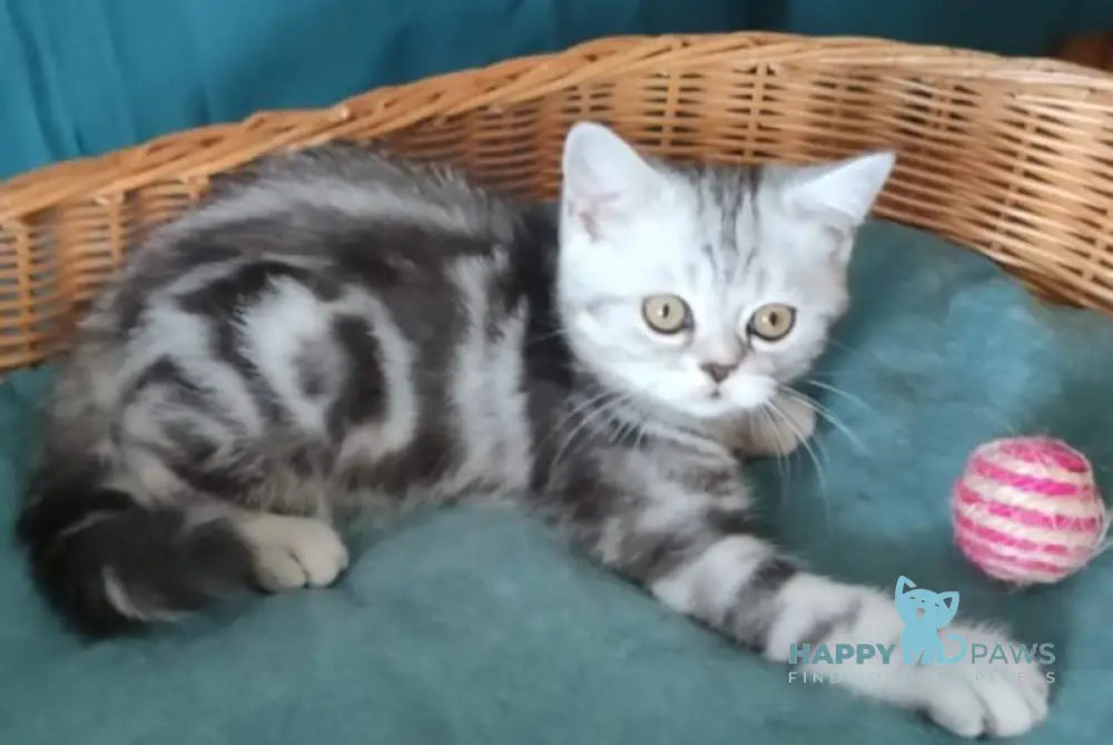 The Queen Mary Scottish Straight female features a captivating black silver tabby coat with a smooth, dense texture characteristic of the breed. Known for her gentle temperament and sturdy build, she offers a perfect balance of elegance and affection, making her an ideal companion for discerning cat enthusiasts seeking a calm and loyal pet with distinctive markings.