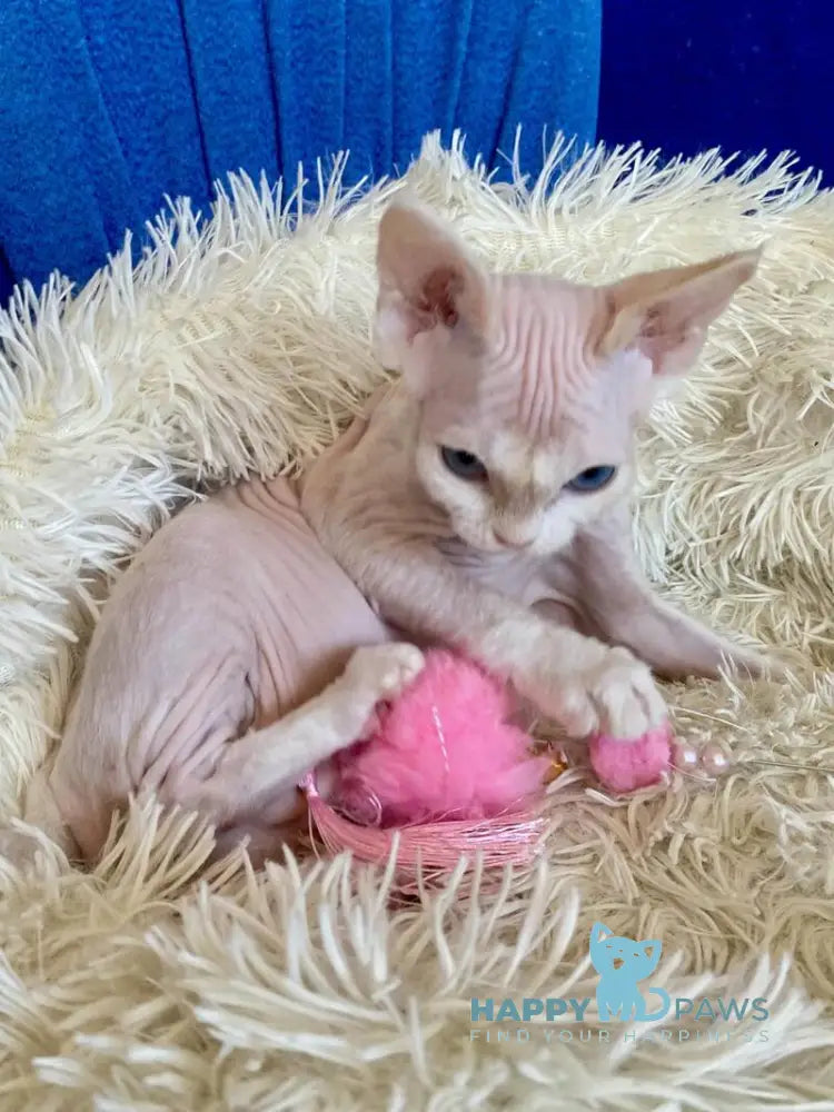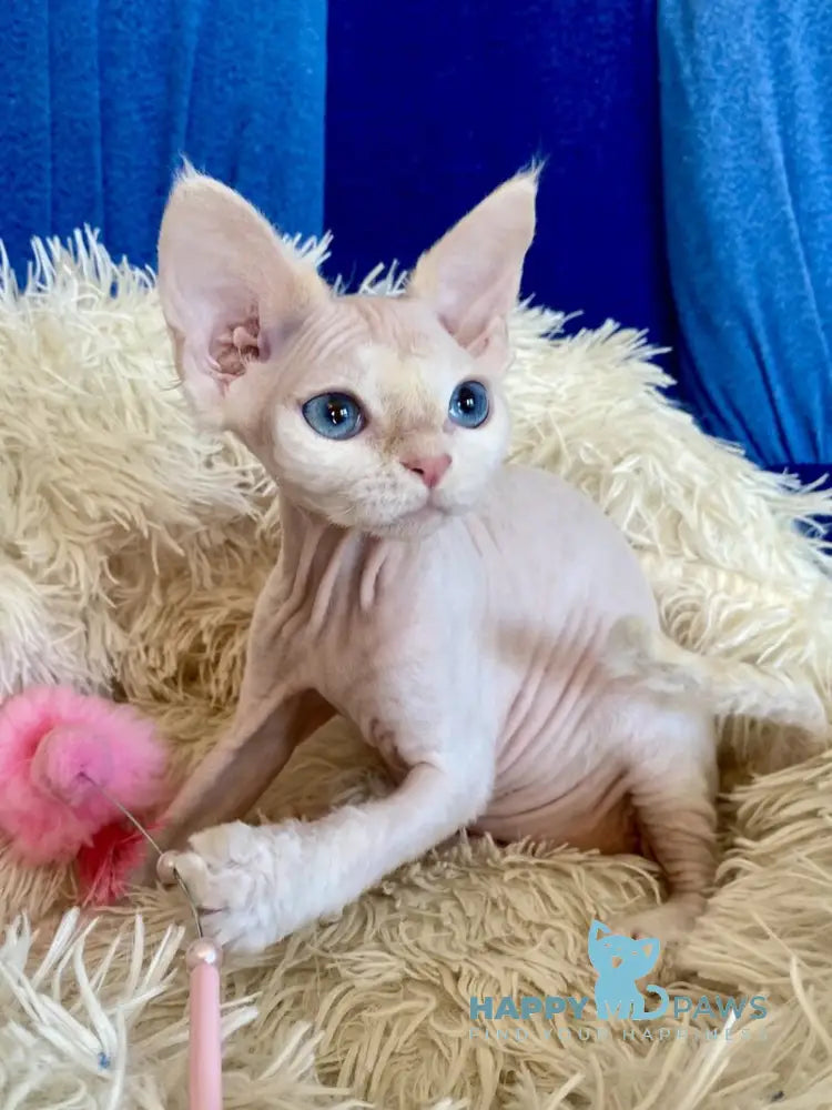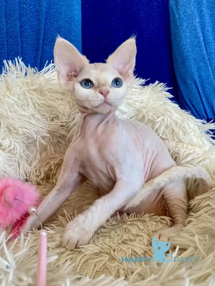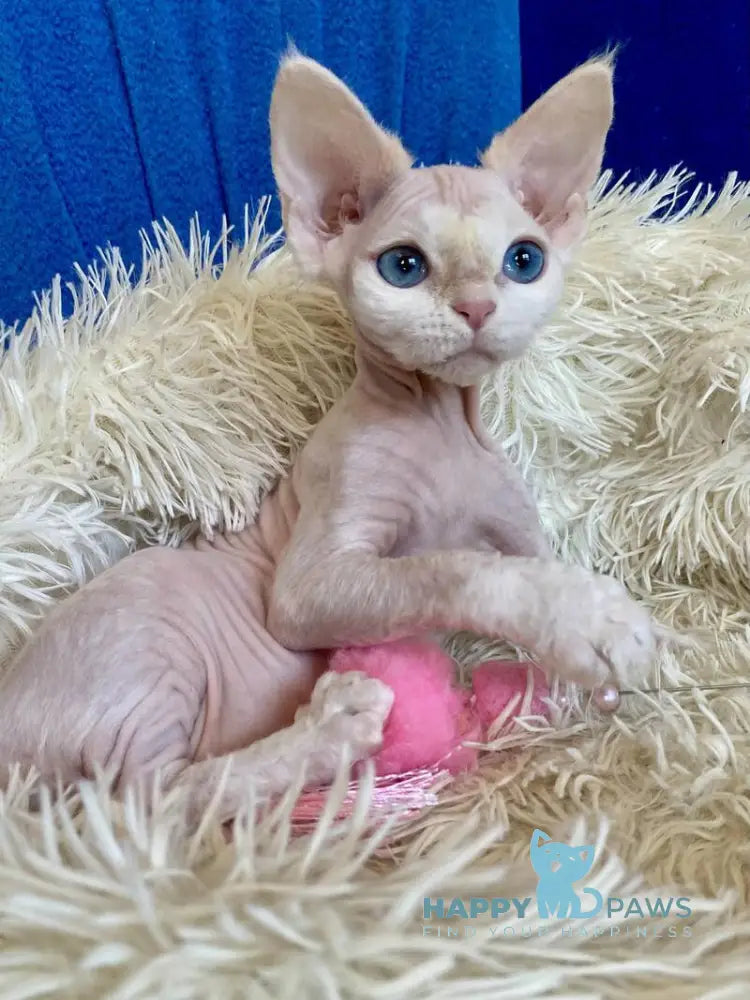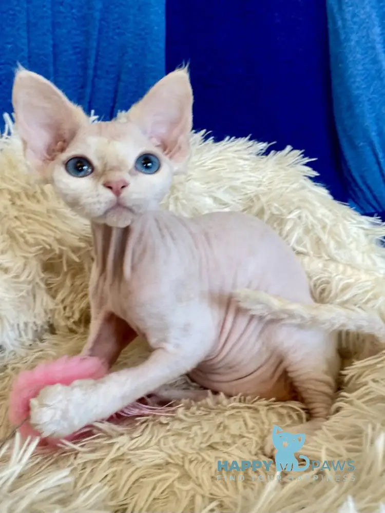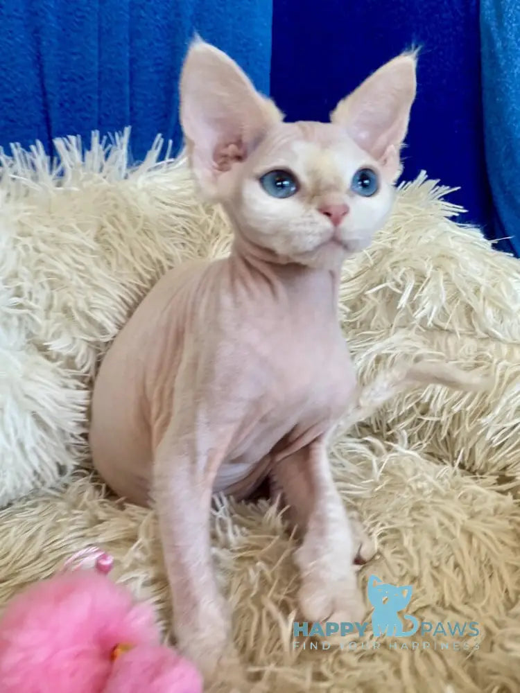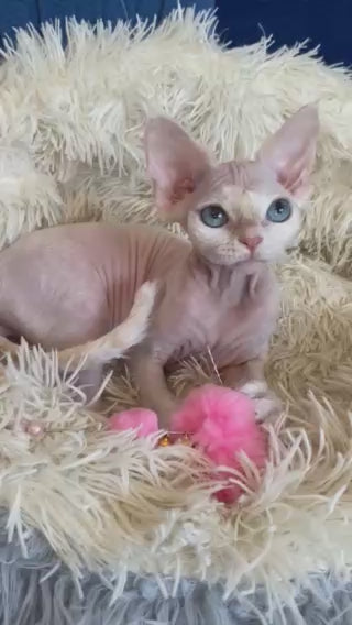 Quentin is a stunning cream-colored Devon Rex male with the breed's signature soft, wavy coat and oversized ears. Known for their playful, affectionate nature, Devon Rex cats are highly social and love being involved in family activities. Quentin's creamy coloring adds to his charming appearance, making him an eye-catching companion. These intelligent cats thrive on interaction and make wonderful pets for households seeking an engaging, devoted feline friend.