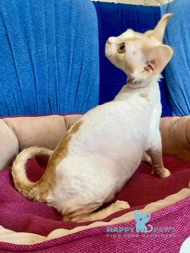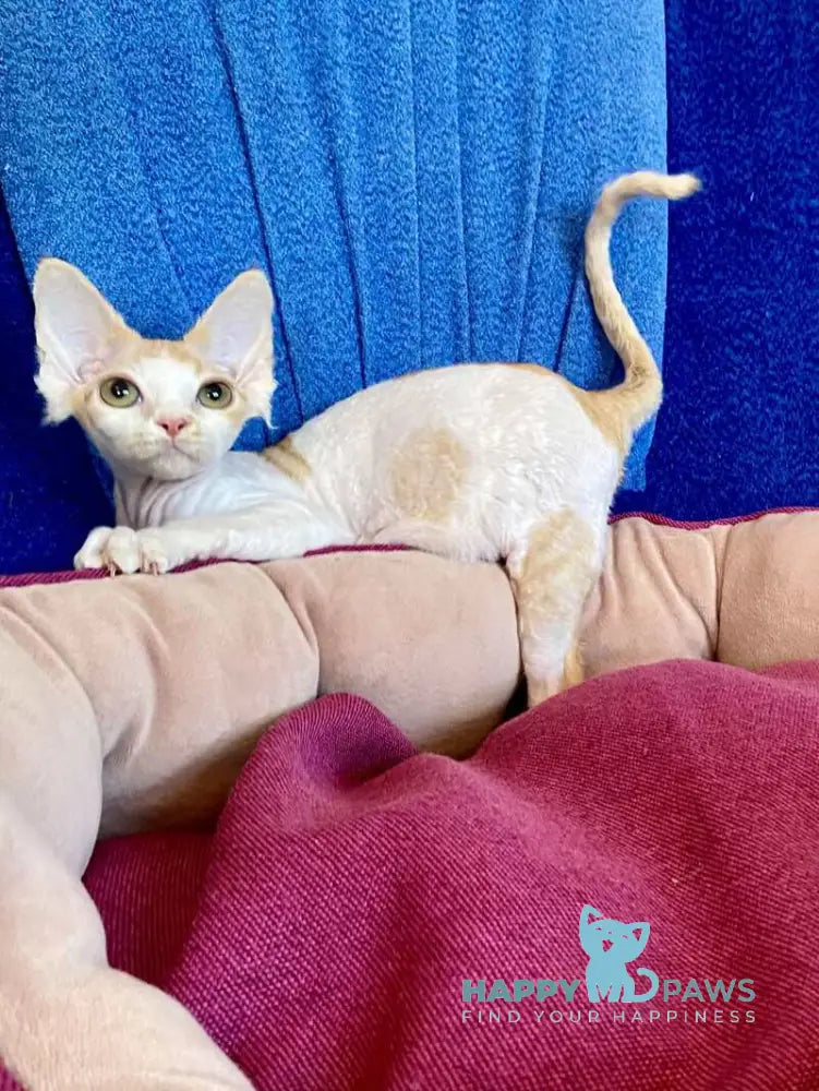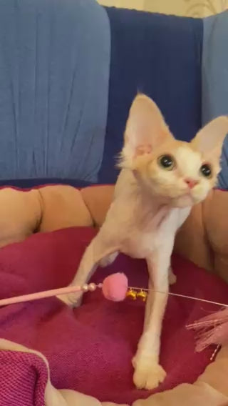 Meet Quinn, a stunning female Devon Rex with a captivating red harlequin coat pattern. This elegant feline features the breed's signature soft, wavy fur and large ears that give her an enchanting, elfin appearance. Devon Rex cats are known for their playful, affectionate personalities and love of human companionship. Quinn's striking coloring and graceful build make her a truly exceptional addition to any loving home. Perfect for families seeking an intelligent, interactive companion with a unique look and devoted temperament.