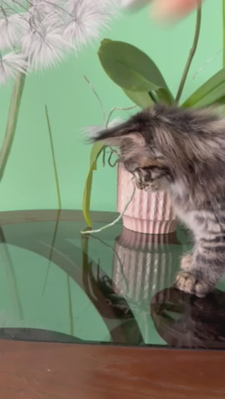 Quintana is a striking male Maine Coon displaying the classic black spotted tabby pattern. This breed is renowned for its impressive size, muscular build, and tufted ears, making Quintana an exceptional example of Maine Coon excellence. His distinctive spotted tabby markings showcase the breed's natural beauty and genetic heritage. Maine Coons are known for their intelligent, affectionate temperament and adaptability to family environments. Quintana combines the breed's characteristic gentle nature with a commanding presence, making him an outstanding choice for those seeking a premium pedigree companion with both aesthetic appeal and wonderful personality traits.